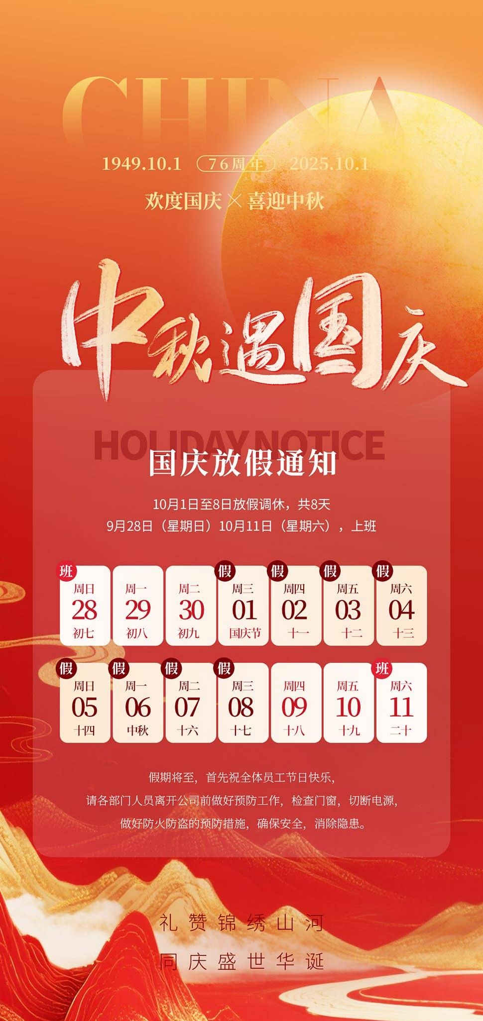 中秋国庆放假时间为:10月1日至10月8日(共8天),9月28日周日、10月11日周六正常上班。